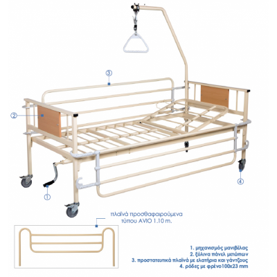 Νοσοκομειακή Κλίνη Χειροκίνητη με πλαϊνά, στρώμα και ρόδες Μονόσπαστη