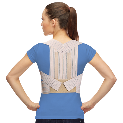 Κατασκευή από αεριζόμενο ελαστικό ύφασμα με εύκαμπτες μπανέλες για τη ραχιαία υποστήριξη. Τιράντες αυτοκόλλητες και διασταυρούμενες στο οπίσθιο τμήμα του κορμού. Πρόσθια εφαρμογή με velcro. Ωμίτες επενδεδυμένοι με foam.