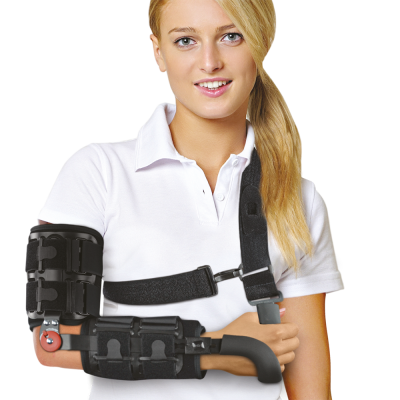 Κατασκευή από μαλακό αφρώδες υλικό “ActivDistance II”. Εσωτερική επένδυση από βαμβακερό, αντιβακτηριδιακό και αντιεφιδρωτικό υλικό. Η εξωτερική αυτοκόλλητη επιφάνεια προσφέρει μεγάλο εύρος εφαρμογής του νάρθηκα. Αποτελείται από δύο τμήματα (βραχιονίου και αντιβραχίου), με ρυθμιζόμενες δέστρες velcro. Φέρει μαλακά μαξιλαράκια προστασίας του αγκώνος και ρυθμιζόμενη τιράντα ανάρτησης άκρας χειρός. Οι αρθρώσεις είναι κατασκευασμένες από υψηλής ποιότητος μεταλλικό υλικό.